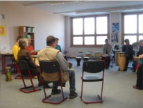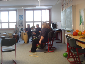 der Leitung von Frau Schönborn beim Trommeln versuchen.